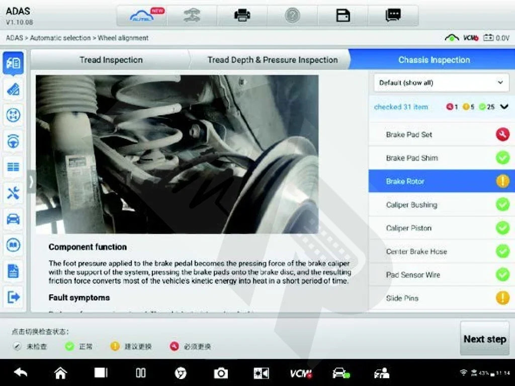 | Vehicle inspection of tires, brakes, suspension, steering, and more. Mark service recommendations, attach photos and notes. | Live alignment reading display. | Illustrated Alignment instructions, live readings, required tools, and adjustment locations display on a single screen. |
