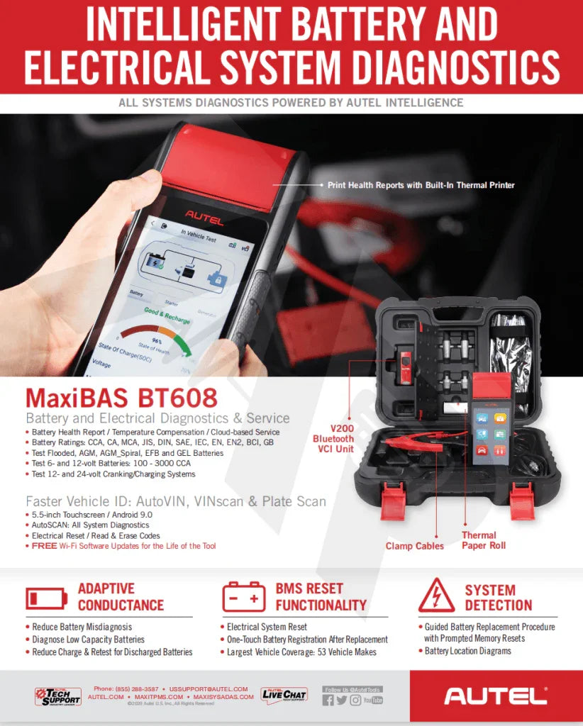 AUTEL BT608 is a touchscreen Battery & Electrical System analyzer that applies Adaptive Conductance, an advanced battery analysis method that produces a more accurate examination of the battery’s cold cranking ability and reserve capacity, vital to determining a battery’s true health. The BT608 can display a quick health status of the existing battery, register a new battery and perform advanced battery and electrical system diagnostics. The BT608’s VINscan function enables quick identification of the vehicle and battery specifications. Read/Clear codes on all available vehicles systems. Print or share customized reports via Wi-Fi or print test reports via the built-in thermal printer.