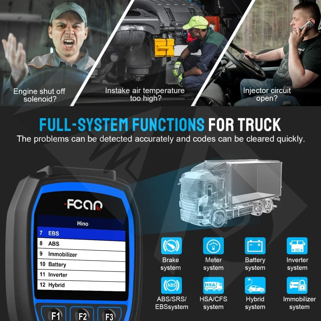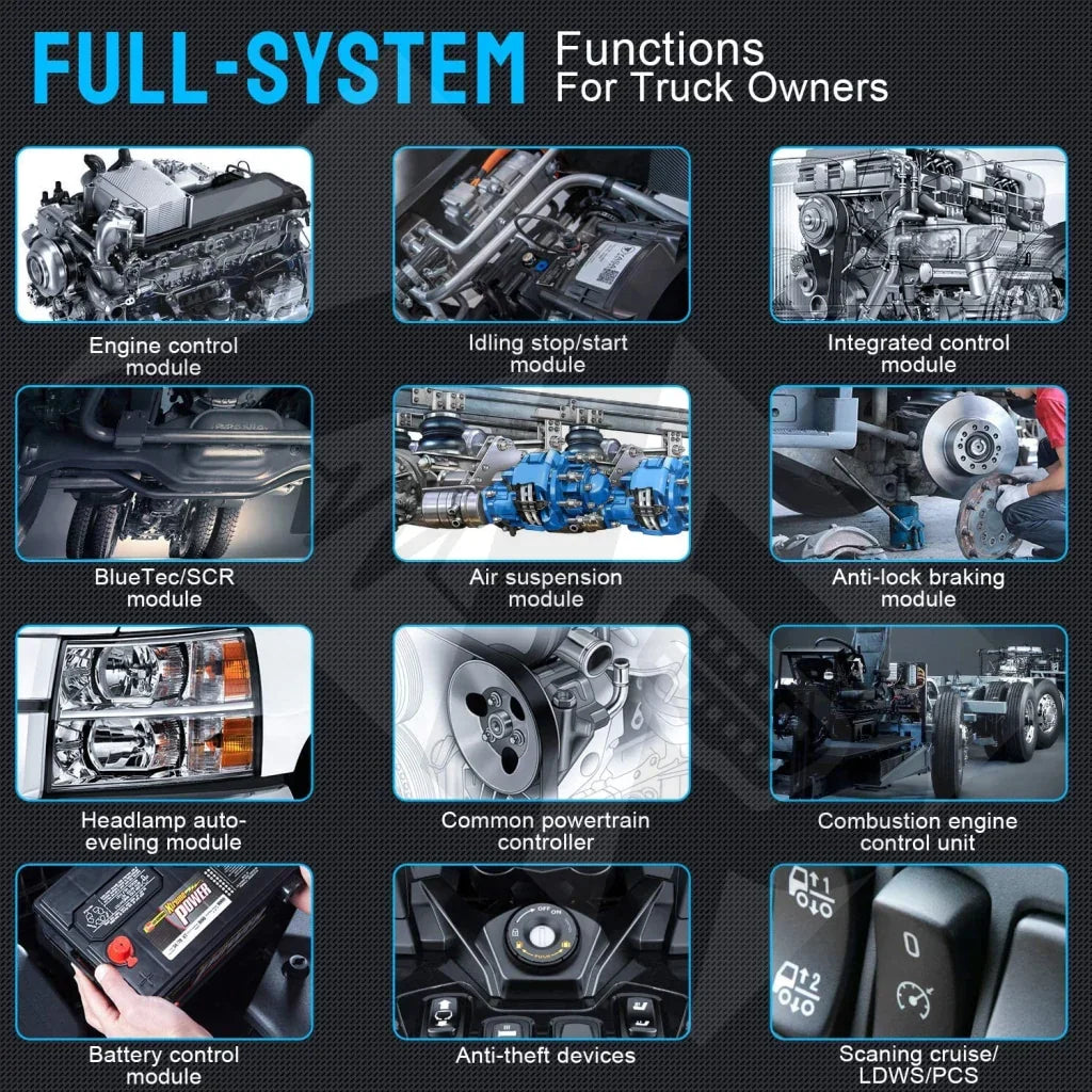 Please note, F506 truck scan tool is capable of diagnosing the systems above, but cannot perform coding & programming or other Bi-directional test functions.