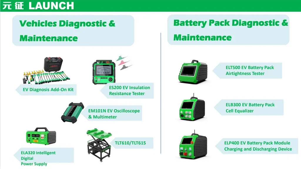 LAUNCH New Energy Battery Pack Diagnostic Upgrade Kit comes with battery pack testing cables for various vehicle brands. The battery pack diagnostic software and some diagnostic software for new energy vehicles can be activated and downloaded with included activation card.