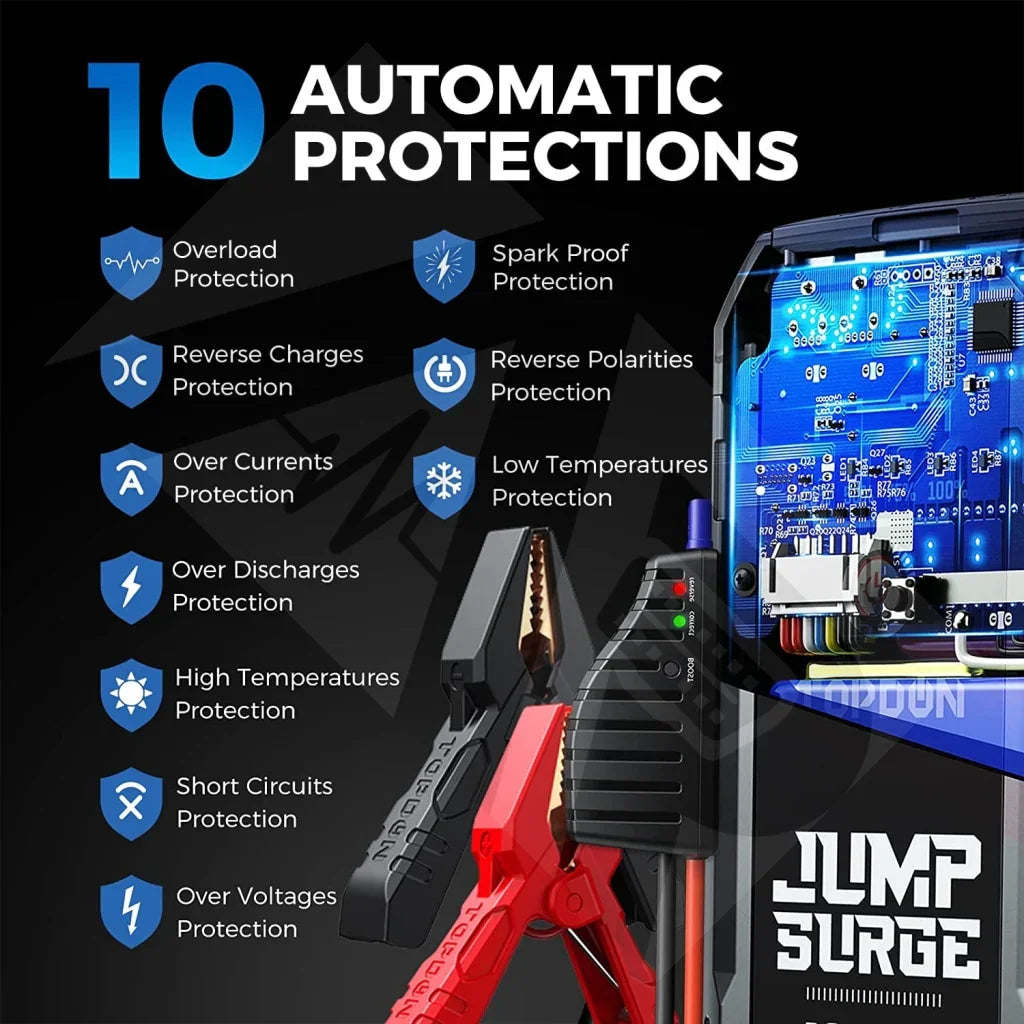 Features multiple layers of protection including reverse polarity, anti-spark, short circuit, overcharge, and overcurrent protection. Jump start your vehicle safely without fear of electrical hazards.