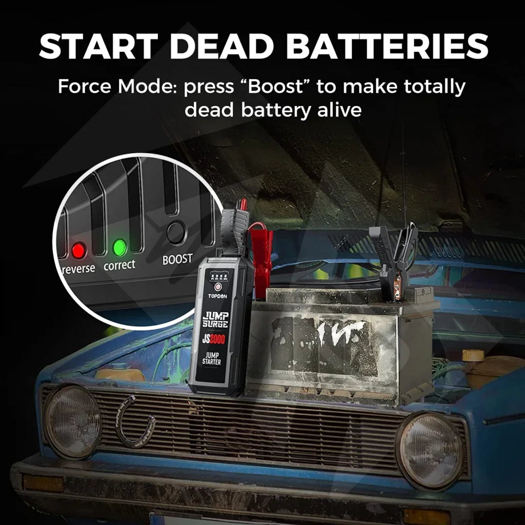 TDU-JS2000The TOPDON JumpSurge2000 is a powerful emergency jump starter for 12V vehicles. It supports gas engines up to 8L and diesel up to 6L. With 2000A peak current, it can revive a dead battery fast and get you back on the road. Built for road trips, daily commutes, and emergencies, it delivers dependable backup power when you need it most.